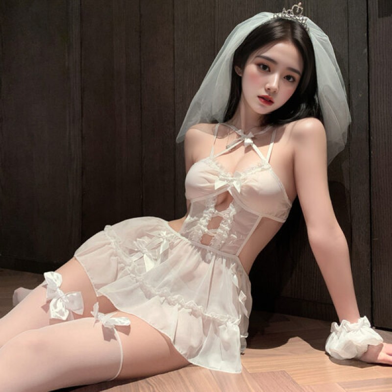 - Complete Bridal Set: Includes a lace babydoll dress, T-back thong, veil, and sheer stockings.